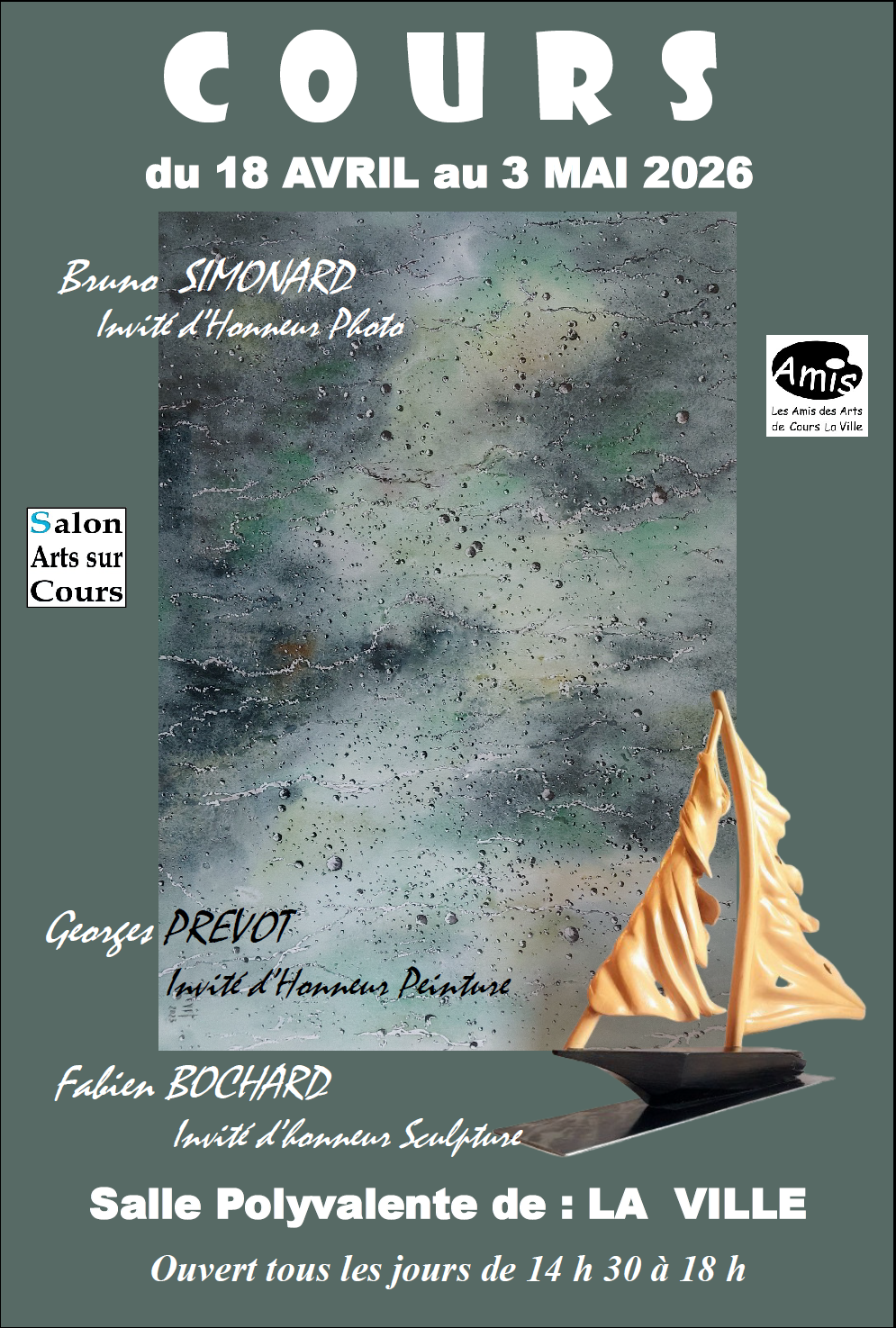 ???? Plongez dans l’univers de la création ! Les Amis des Arts de Cours vous invitent à leur Salon 2026, un rendez-vous vibrant où peinture, sculpture et photographie se rencontrent pour éveiller vos sens. ???? Du 18 avril au 3 mai de 14h30 à 18h ???? Salle polyvalente de LA VILLE (à seulement 3 km de Cours) 106 place Benoit Fusy, 69470 COURS ???? Vernissage le 18 avril à 17h, venez célébrer l’ouverture avec nous ! ✨ Laissez-vous surprendre, émouvoir et inspirer par des œuvres uniques dans une ambiance conviviale et chaleureuse. ???? Plus d’infos : www.amis-des-arts-69470.point-artistes.fr